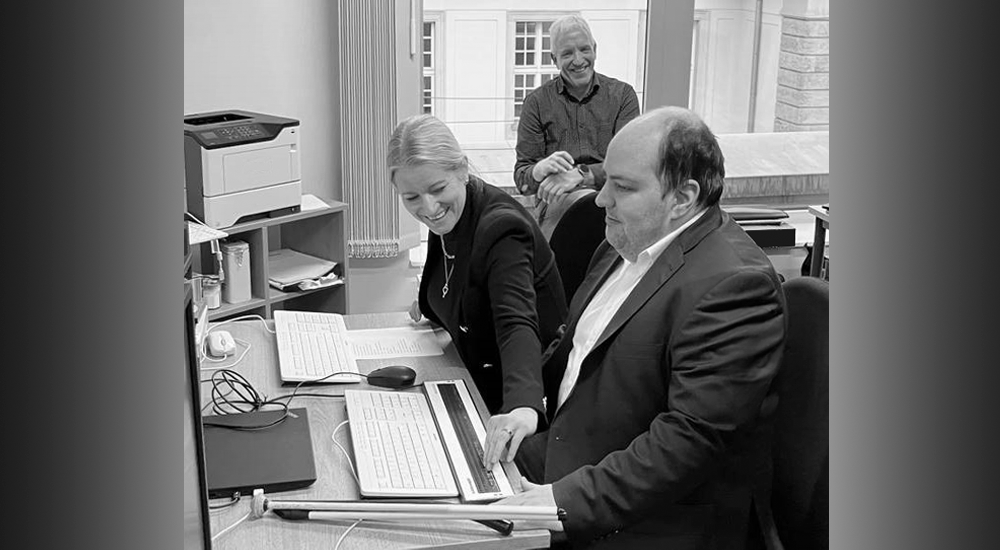 Das Bild zeigt, wie die Ministerin nach einer Erklärung von Herrn Philip Fischer, einem Justizangestellten und Mitarbeiter der Kompetenzstelle, die Textausgabe des Bildschirminhalts auf einer Braillezeile testet.